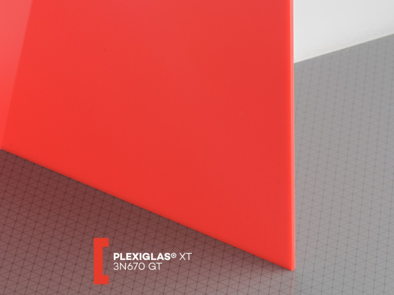 Barevné červené akrylátové desky Plexiglas XT 3N670 v tl. 3 mm, s propustností světla cca 2% (podobné RAL 3000 / 3020). Extrudované plexisklo je základní a nejrozšířenější typ plexiskla. Materiál je vysoce odolný proti UV záření a povětrnostním vlivům. Obě povrchové strany těchto desek z plexiskla jsou hladké a vysoce lesklé, dodávané s ochrannou folií. Široké použití v reklamě, stavebnictví a průmyslu. Výroba extruzí znamená, že desky jsou tzv. vytlačované mezi dvěma proti sobě rotujícími válci. Z tohoto důvodu má tento typ plexi větší vnitřní pnutí, než lité plexisklo Plexiglas GS. Má malou tloušťkovou toleranci.